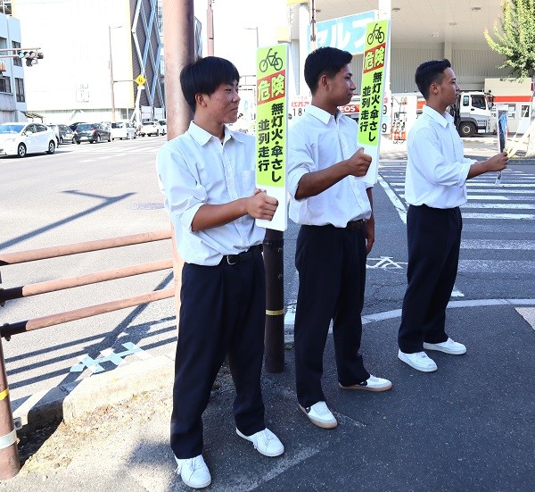 県教委の「長期休業明け交通安全特別強化週間」に合わせた取り組みで、夏休み明けで生活のリズムが変わる生徒たち自身の交通安全意識を高めるのに加え、本校周辺を通る歩行者や自転車、自動車にルール順守を呼びかけるのが目的。生徒会、野球部、剣道部、女子バレーボール部、吹奏楽部の生徒と教員合わせて48人、高松北署の署員3人が参加しました。