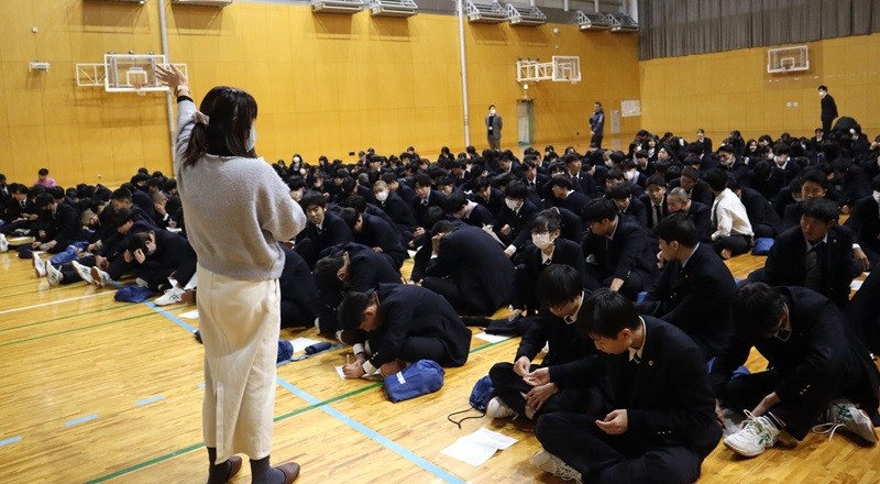 本校と穴吹学園が連携して取り組むキャリア教育・地域人材養成事業の授業が15日、進路決定を控えた2年生を対象に体育館で行われました。
