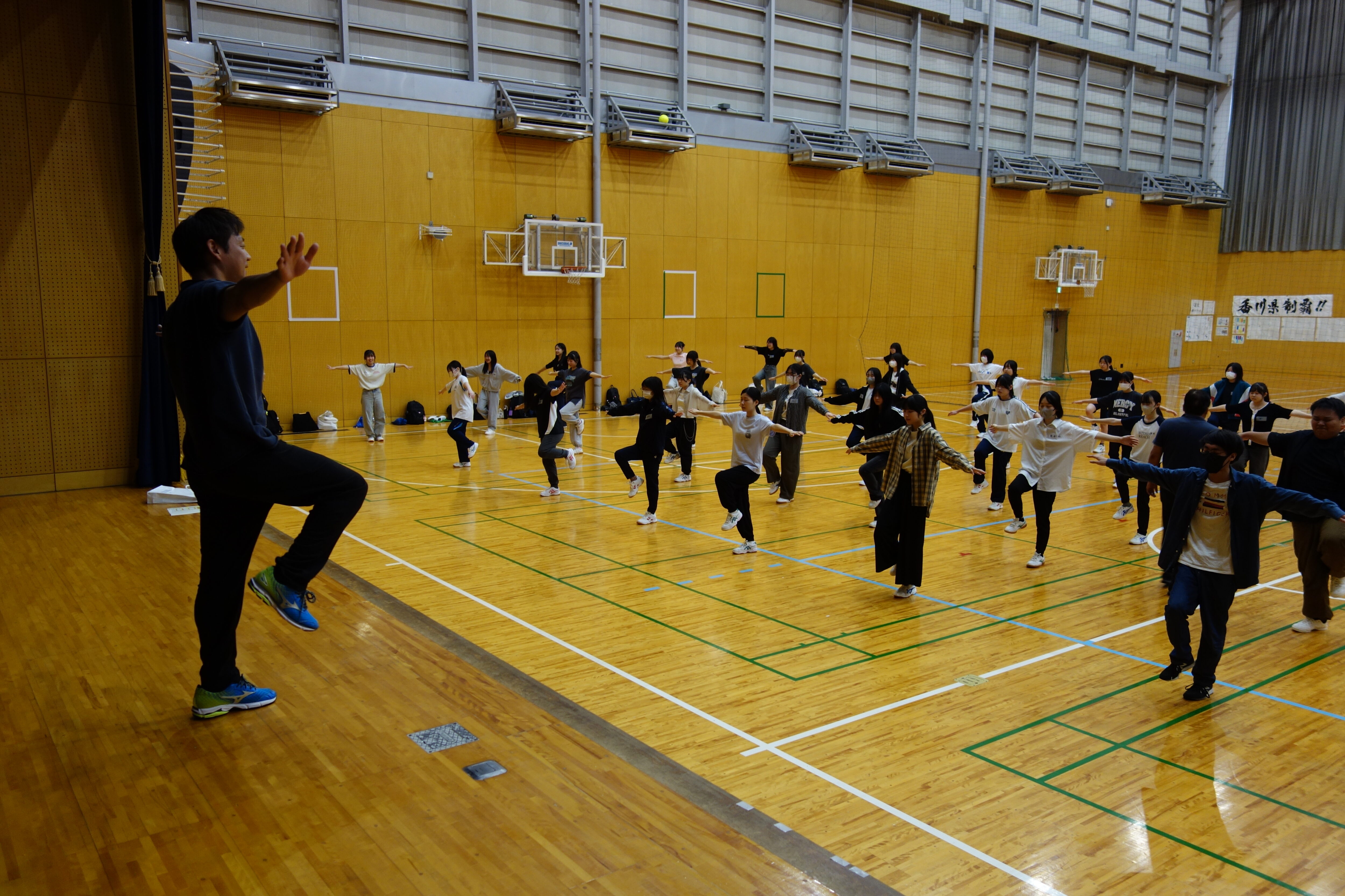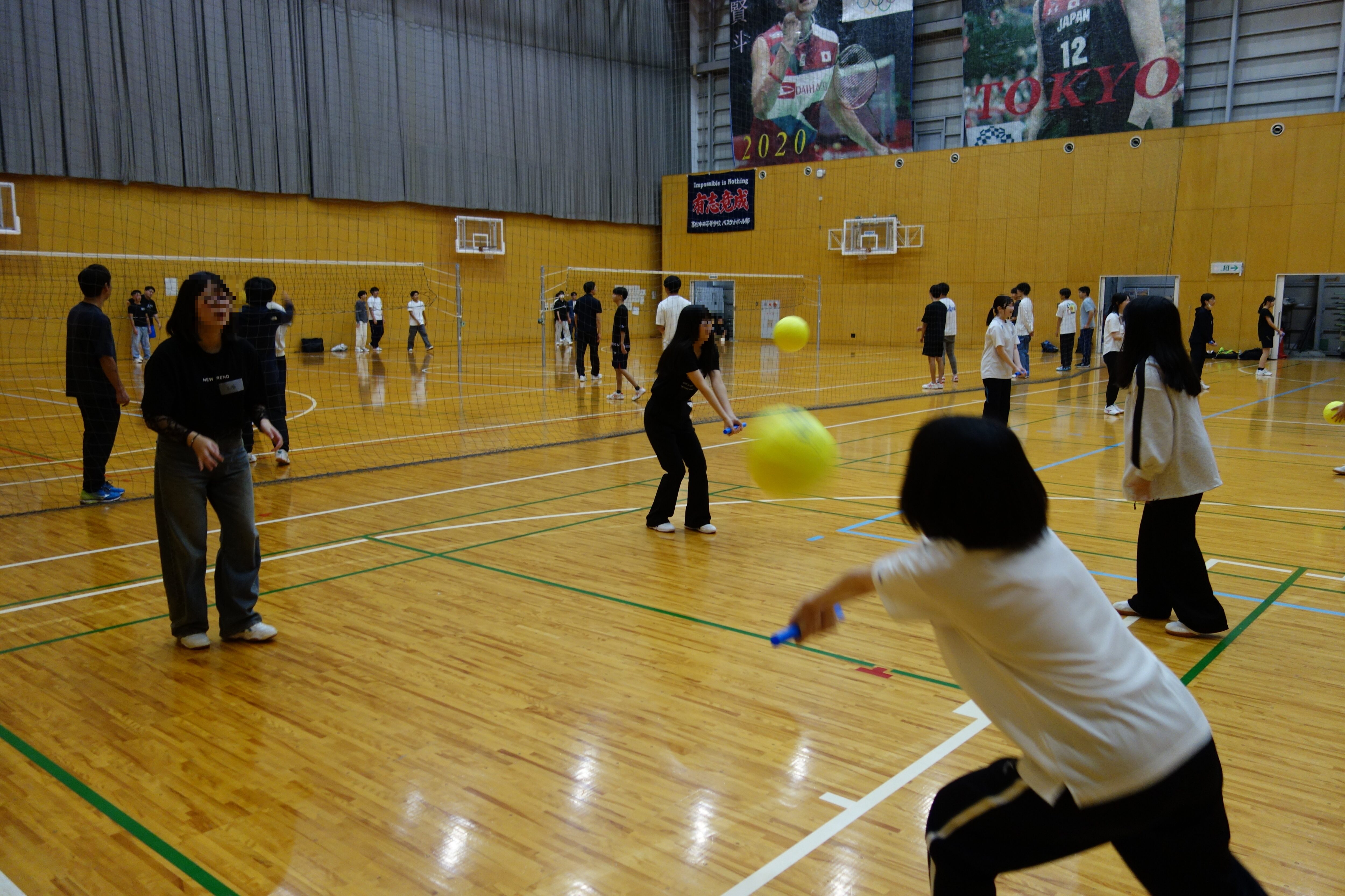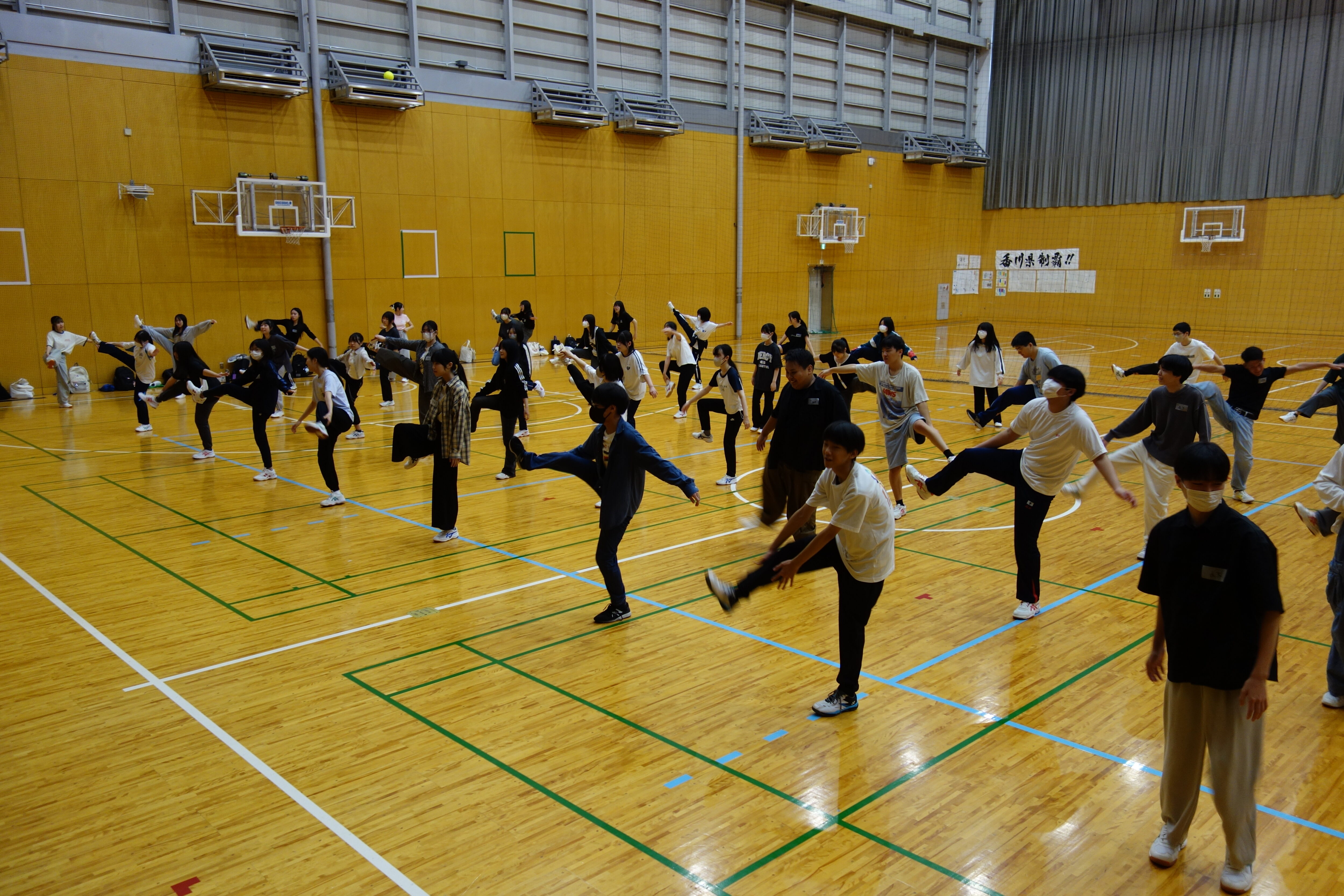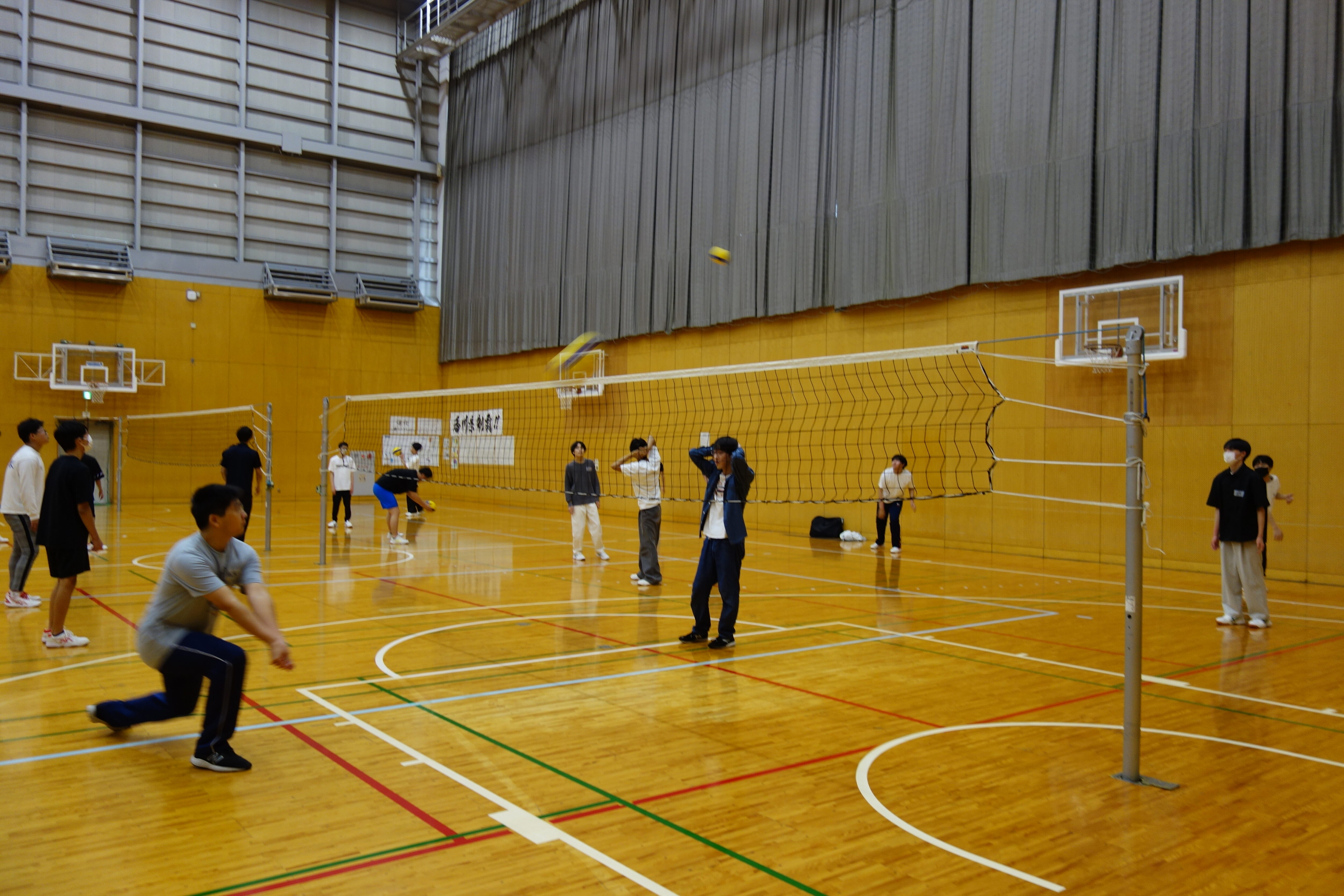 体育館での体育実技の様子  全体で体つくり運動の後、球技の授業で今日はバレーボールの実技でした。