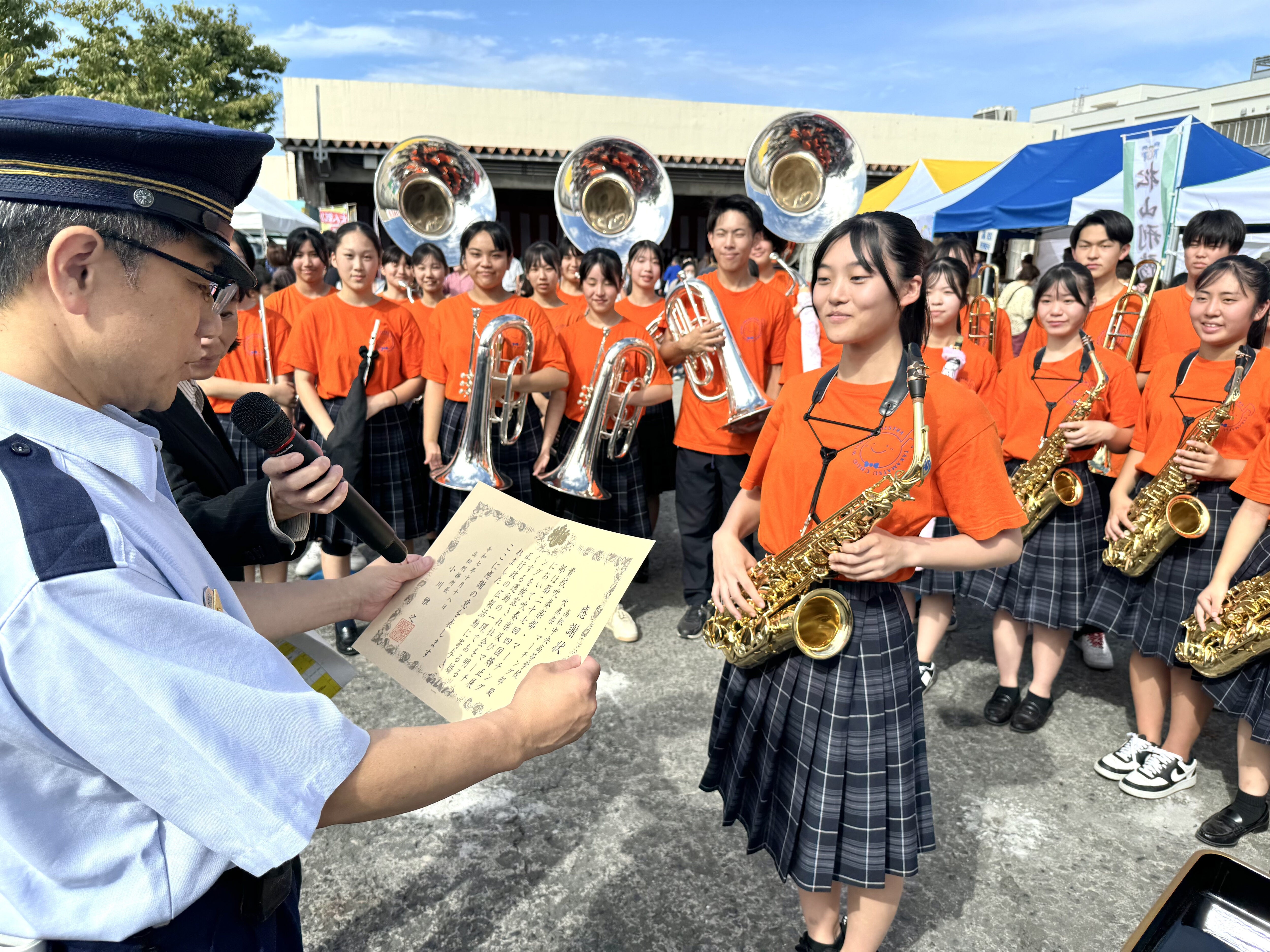 当日は、俳優の寺島進さんが一日署長として来場され、吹奏楽部の演奏にも温かい拍手と応援を寄せてくださいました。