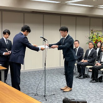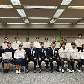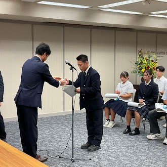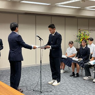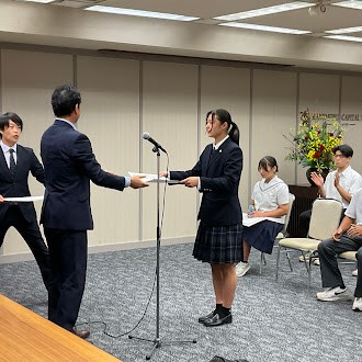 10月17日(金)、令和7年度全国高校総合体育大会(中国インターハイ)で優秀な成績を収めた選手らの県高体連主催表彰式が、高松市中野町のKANEMITSU CAPITAL HOTELで行われ、本校からは空手道部と大畠虎太郎顧問が出席しました。女子は団体組手優勝および学校対抗総合優勝という輝かしい成績で、代表として三浦咲都選手が表彰状と優勝者チーム(個人)にのみ送られるブルーの美しい盾を授与されました。また男子は団体組手2位と学校対抗総合2位と、こちらも素晴らしい成績で、代表として三木統嗣選手が表彰状と盾を手にしました。さらに男子個人形2位の黒田杷琉選手も、表彰状と盾を受け取りました。今後空手道を続ける選手もいますが、まずは後輩たちを引っ張ってきた3年生、お疲れ様でした。1・2年生には、先輩の背中を追って伝統を引き継いで欲しいと思います。なお、優勝監督として、大畠虎太郎顧問も表彰されました。