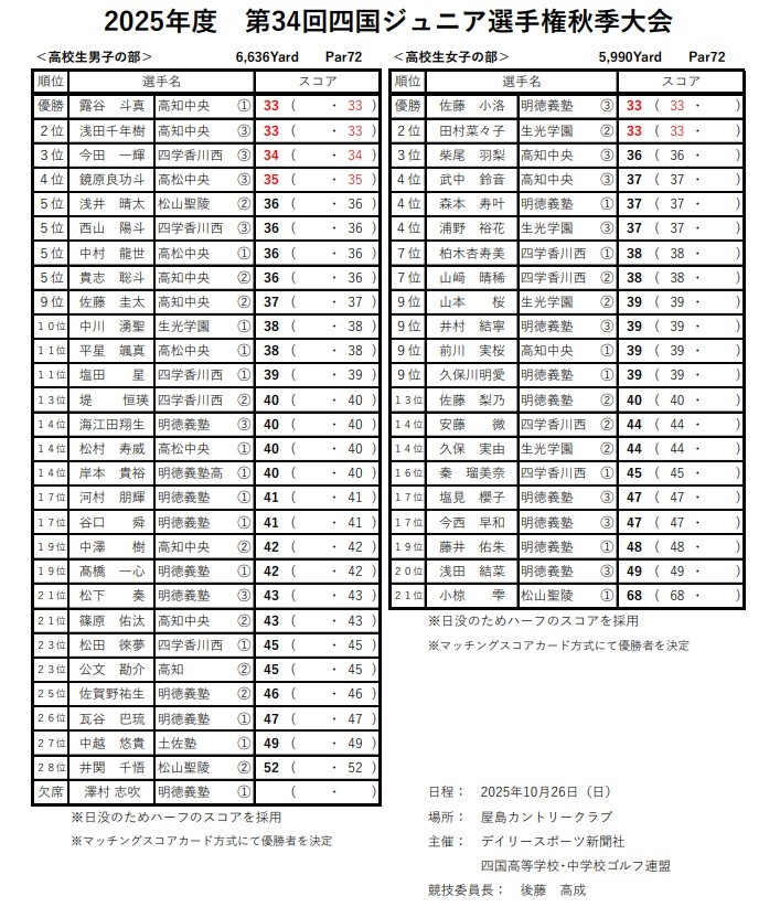 第34回四国ジュニアゴルフ選手権秋季大会2025年10月26日クラブ活動, 最新情報・お知らせ, 運動部okamoto25日(土)26日(日)屋島カントリークラブで第34回四国ジュニアゴルフ選手権秋季大会が開催されました。【主催】デイリースポーツ、四国高等学校・中学校ゴルフ連盟【後 援】 四国ゴルフ連盟、屋島カントリークラブ、四国新聞社、RNC西日本放送本校全日制では、1年生の中村龍世選手が5位タイで入賞しました。濃霧で2時間半遅れの試合となりました。後半は日が暮れてしまいハーフでのスコア判定になりましたが、雨の中頑張りました。 シェアする サイト内を検索