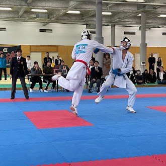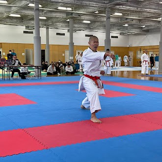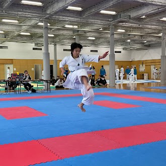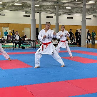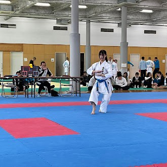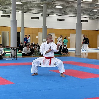 個人形、個人組手、団体組手に加え、新人大会では3人1組での団体形があります。本校はバッサイダイを演武、優勝しました。