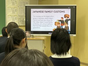 10月23日の第1回では自己紹介と学校紹介を行い、10月31日の第2回では「かるた」「もったいない」などの日本文化を紹介し、インドネシア側からは火山についての発表を聞きました。11月20日の第3回では、日本の清掃文化を紹介し、相手校の生徒からジャワ民族についての発表を聞き、互いの文化への理解を深めました。