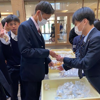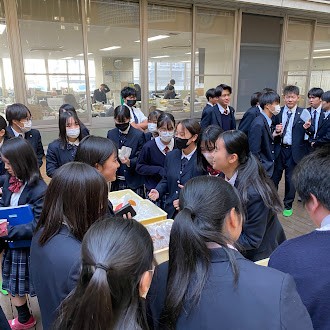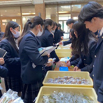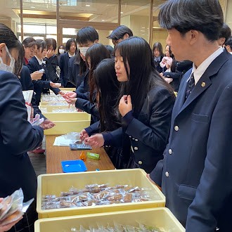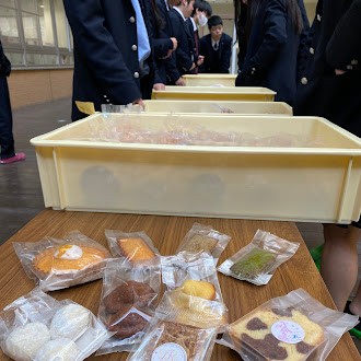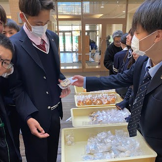〜商業科2年生が校内で販売実習〜商業科2年生が5日(金)、「商品開発と流通」の授業の一環として、校内で洋菓子の販売実習を行いました。本校と高校・専門学校連携事業(高専連携)に取り組んでいる穴吹パティシエ福祉カレッジに協力を依頼。販売価格や包装を生徒たちが相談して決め、同カレッジの学生が作ったお菓子を仕入れました。この日は、フロランタン、フィナンシェ、マドレーヌ、パウンドケーキ、スノーボールの5種類、約960個を準備し、昼休みにインターテラスで販売。値段は買いやすいように、1個100円と120円、お得セット300円で販売しました。「おいしい」や「安いからこれとこれも買おう」など生徒や教職員が列をつくり、次々に買い求めていました。