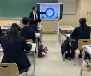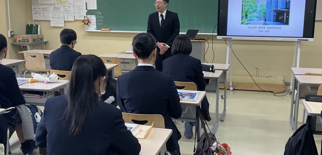 12月17日(水)、1・2年生の特別進学コースを対象に松山大学薬学部より中村承平教授をお招きし、校内説明会を実施しました。前半の薬学部の紹介では、薬学部での学びの内容や薬剤師になるまでの道のり、薬剤師の仕事内容に加え、学費や薬学の歴史に至るまで幅広く紹介していただきました。また、後半の模擬授業では薬の基本的な知識・薬を取り巻く状況・薬との付き合い方について講義していただきました。薬は投与方法で効き方に違いがでることや、患者が服薬時のストレスを無くすよう高機能な薬を開発・製造していることなど、具体的なことを交えて説明していただきました。