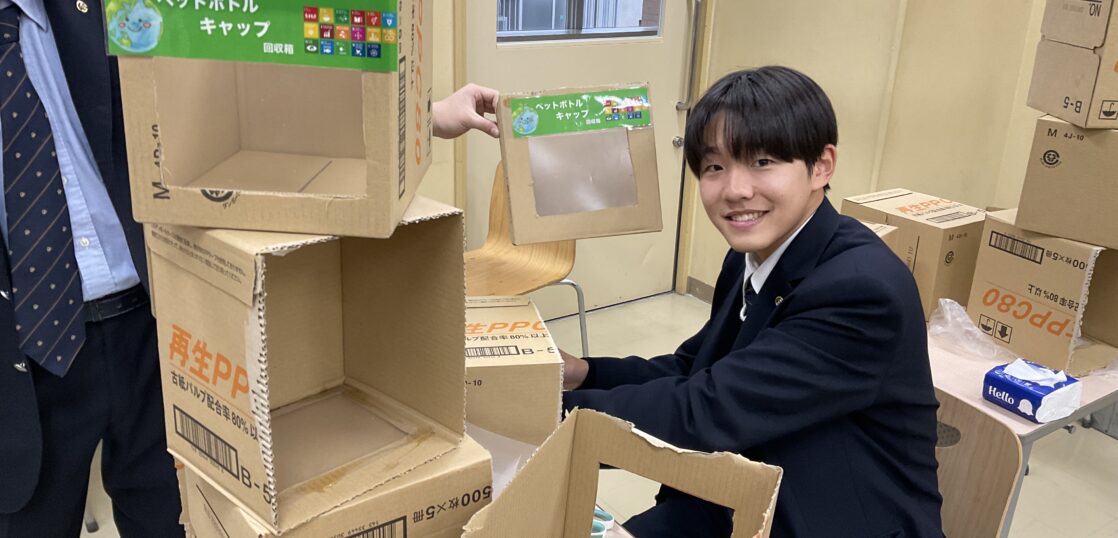 今回のリニューアルのポイントは、生徒たちのアイデアによる「見える化」です。箱の一部を透明にすることで、溜まっていく様子をリアルタイムで確認でき、回収への意識を高める工夫を凝らしました。