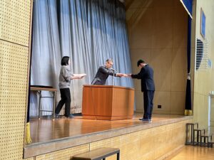 表彰式の後、校長先生から「キリスト教には『シルバールール』というのがあります。それは、『自分がされて嫌なことは人にしない』というルール。同じような意味のことが『論語』の中にも出てきます。また、『「ゴールデンルール』は『自分にしてほしいことを人にしなさい』というものです。『論語』にも同じように載っているでしょうか? 調べてみましょう。三学期もあと少し、最後まで頑張っていきましょう。」と興味深く、あたたかいメッセージをいただきました。