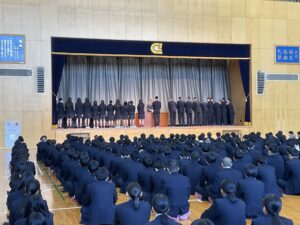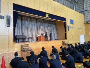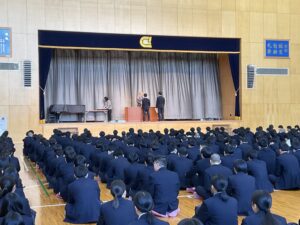 2月2日(月)、3年生は将来に向けて準備する期間となり、1・2年生だけで全校集会が行われました。