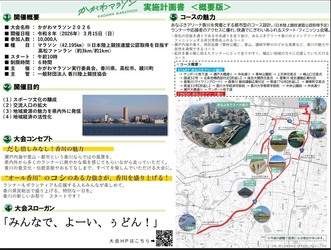 「かがわマラソン2026 」が、令和8年(2026年)3月15日(日)にⅠ万人の参加で行われます。記念すべき第1回大会で、42.195㎞を走ります。あなぶきアリーナ香川を発着とする都市型のコース設計で高松の目抜き通りである中央通りを走り抜け、あなぶきアリーナ香川のメインアリーナ内でフィニッシュする非日常感あふれるコースです。瀬戸内海や島々、特別名勝「栗林公園」、里山、讃岐平野ののどかな風景など、香川の魅力や自然を満喫できるコースで起伏を最小限に抑えたランナーにとって走りやすく、幅広い地域の方々に応援していただけるコースでもあります。本校からは、28名のボランティアSTAFFを派遣します。2月12日(木)かがわマラソン実行委員会事務局より、当日の作業内容や役割の確認としての説明会がありました。陸上部、体操部、ボランティア同好会、コーラス、放送、美術部等の生徒は、熱心に確認をしました。STAFFウエアも配布されました。本校生徒は、大会前日14日(土)の「ランナー受付」と大会当日15日(日)のスタート手荷物預かりに協力することになりました。大会スローガン「みんなで、よーい、ぅどん!」のもと、ランナーもボランティアも応援する人もみんなが楽しめて、香川県民総出で盛り上げる、特別な一日を期待します。